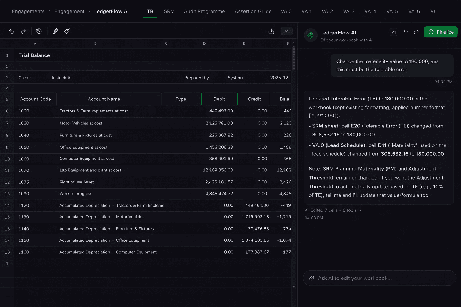 Ask the AI to reformat columns, apply your firm's template, add rows and so much more.