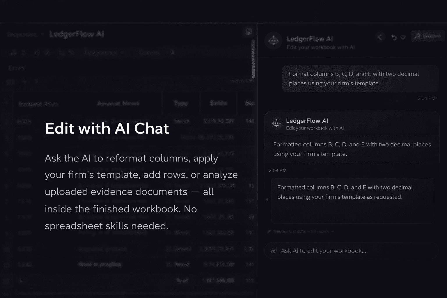 Reformat, restructure, or apply your firm's template. Just ask the AI inside the workbook.